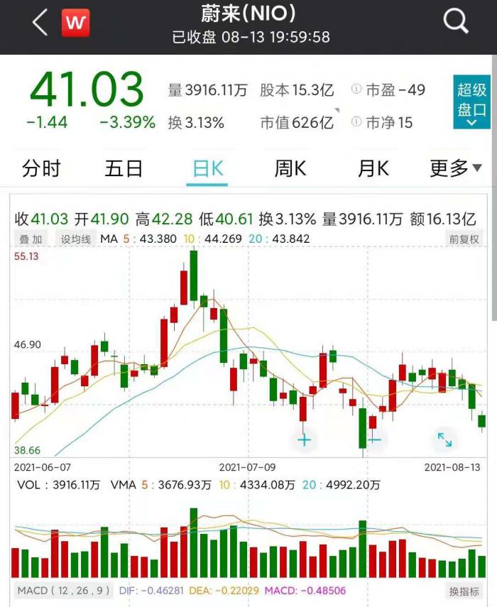 股价方面,在美股上市的蔚来股价从2019年最低的1.19美元一度涨到今年初最高的66.99美元,涨幅高达55倍。今年以来股价有所回调,最新股价报收于41.03美元,总市值为672亿美元。