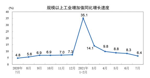 国家统计局8月16日公布的数据显示,7月份全国规模以上工业增加值同比增长6.4%,比6月份回落1.9个百分点,近两年7月份工业增加值平均增长5.6%,增速比6月份回落0.9个百分点,已经连续3个月回落且降幅加大。
