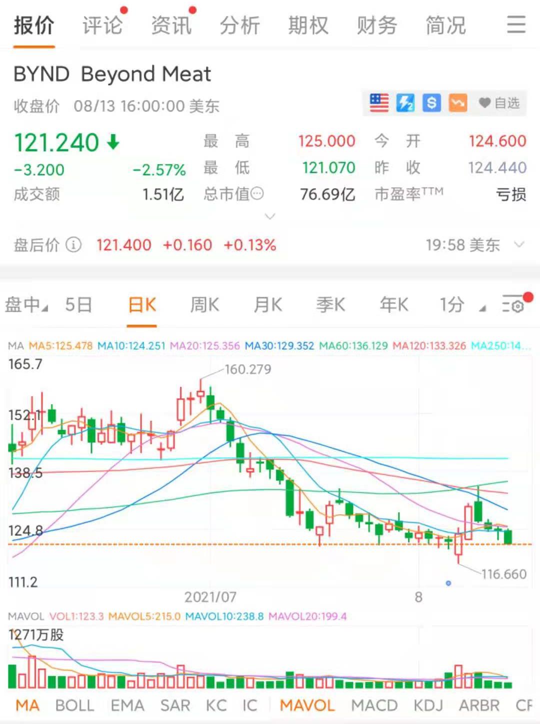 8月13日,Beyond Meat的收盘价是121.24美元,今年以来仍然录得下跌。根据股票数据跟踪网站Whalewisdom.com的测算,BG对该股的持仓成本是每股146.60美元,目前看起来是“白忙了一场“。
