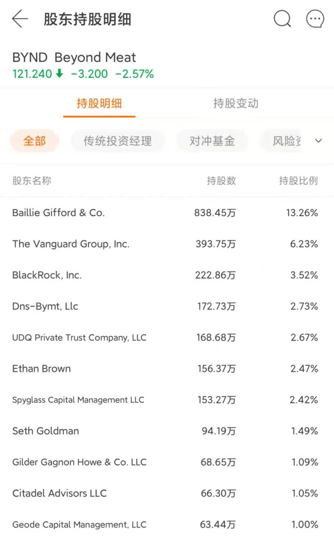 从去年二季度开始,针对“植物肉第一股”——Beyond Meat(BYND),BG开启了“买买买”模式,到了今年二季度末,已经成为该公司的第一大机构股东,持股比例高达13.3%。