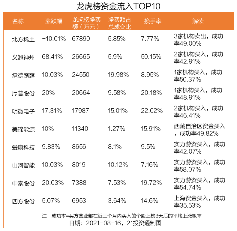 8月16日,上证指数上涨0.03%,深证成指下跌0.71%,创业板指下跌1.31%。盘后龙虎榜数据显示,共有45只个股因当日异动登上龙虎榜,资金净流入最多的是北方稀土(600111.SH),达6.79亿元。