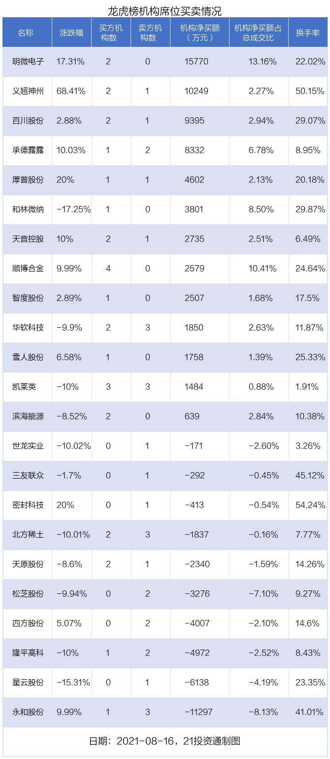 8月16日,21只个股龙虎榜出现了机构的身影,机构合计净买入1.14亿元。具体来看,机构净买入11股,净卖出10股。