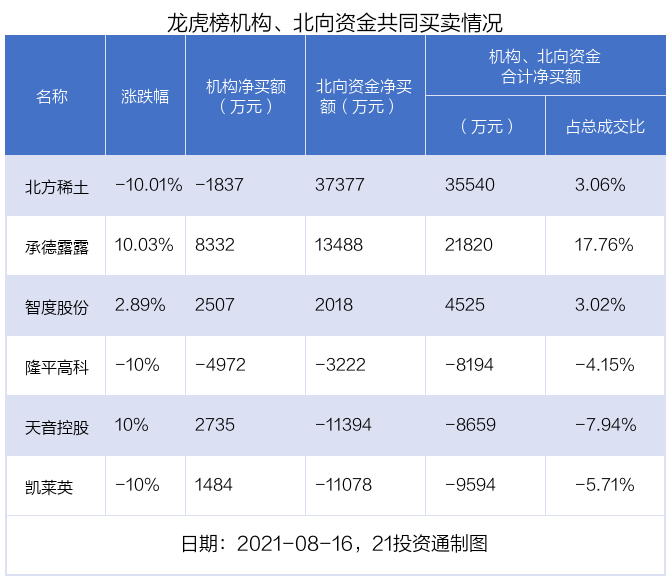 值得注意的是,机构和北向资金共同净买入了承德露露、智度股份等2股;共同净卖出了隆平高科;在北方稀土,凯莱英,天音控股上出现分歧,机构净卖出北方稀土1837.34万元,北向资金净买入3.74亿元。