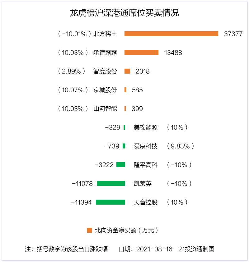 据21投资通(微信号ID:touzit21)智能监测,21只个股龙虎榜出现了机构的身影,北向资金参与龙虎榜中的个股共涉及10只。