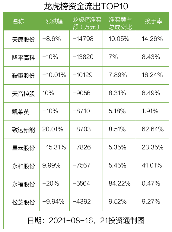 而龙虎榜中资金净流出最多的是天原股份(002386.SZ),被净卖出为1.48亿元,占总成交金额的10.05%。天原股份收盘下跌8.6%,换手率为14.26%。