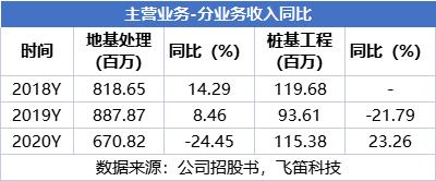 地基处理,指的是为提高地基承载力,改善土体强度和变形性质或渗透性而采取的人工处理地基的方法,公司地基处理业务主要分布在东南亚、南亚、中东和境内。2020年,这块业务实现收入6.71亿元,同比下滑24.45%,收入增速下滑,带动主营业务收入下滑。