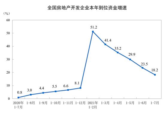 1—7月份,房地产开发企业到位资金118970亿元,同比增长18.2%;比2019年1—7月份增长19.2%,两年平均增长9.2%。其中,国内贷款15402亿元,下降4.5%;利用外资44亿元,下降44.4%;自筹资金35533亿元,增长10.9%;定金及预收款45398亿元,增长38.3%;个人按揭贷款18953亿元,增长17.0%。