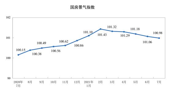 7月份,房地产开发景气指数(简称“国房景气指数”)为100.98。