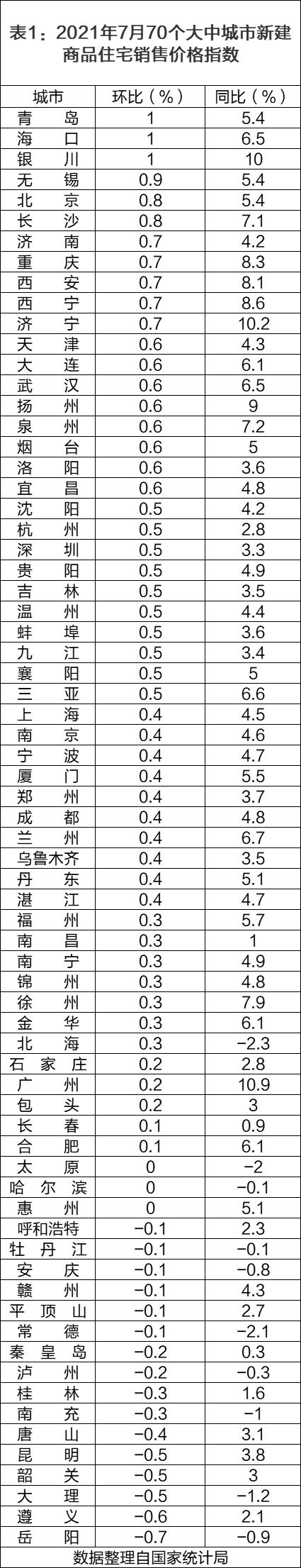 数据显示,7月份,51个城市新房价格环比有所上涨,其中青岛、海口、银川领跑,环比涨幅均为1%。岳阳领跌,环比跌幅为0.7%。
