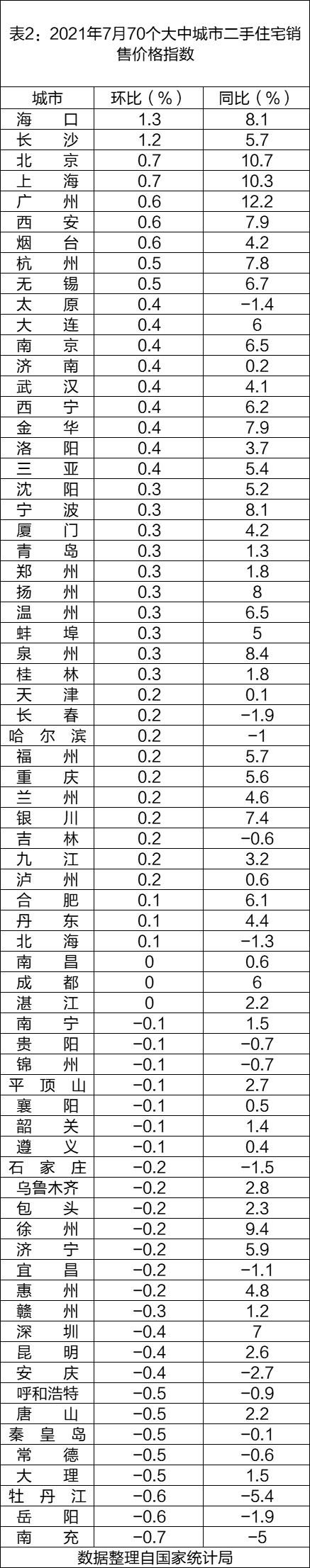 二手房方面,7月份海口、长沙环比涨幅分别为1.3%、1.2%,领涨70城。南充领跌,环比跌幅为0.7%。