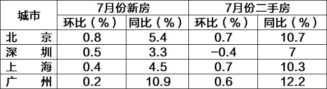 7月份,一线城市新建商品住宅销售价格环比上涨0.4%,涨幅比上月回落0.3个百分点。其中,北京、上海和广州环比分别上涨0.8%、0.4%和0.2%,涨幅比上月分别回落0.1、0.1和0.8个百分点;深圳上涨0.5%,涨幅与上月相同。
