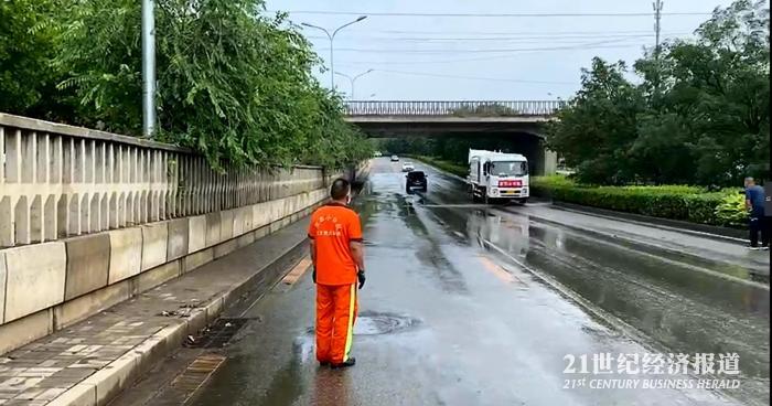 一位现场工作人员告诉21世纪经济报道记者,昨晚雨下得很大,水位最高时淹没了铁道桥南边平坦处辅路的马路沿,但积水并未持续很长时间,雨势转小之后,积水就逐渐排出。