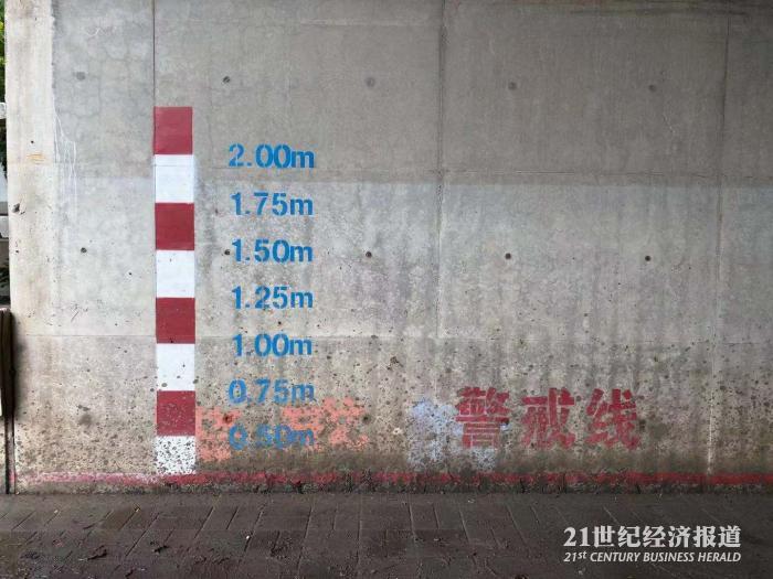 8月17日一早,21世纪经济报道记者在事故现场——旱河路下穿西沙线铁路桥发现,桥下画有水位线。海淀区水务局一位工作人员告诉21世纪经济报道记者,“这里最高积水记录应该是50厘米,而根据水印和泥印的痕迹,昨晚桥下水位最深处达到1.75米。”现场仍有明显土腥味,清淤车辆正在桥下作业。