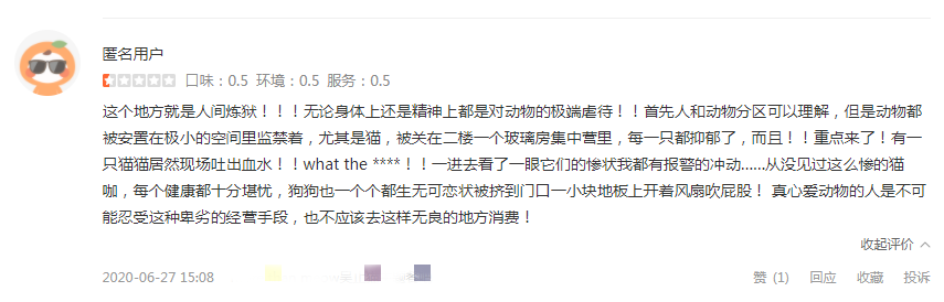 气味和卫生,一直都是宠物餐厅的老大难。记者在大众点评上查询了多家动物餐厅,发现几乎每一家的差评都与气味和卫生问题有关。比如上文记者走访的一家餐厅就有人评价道,“这家猫咖环境很差,整个店里味道很重!那个猫猫馆的味道差点就让人受不了。”