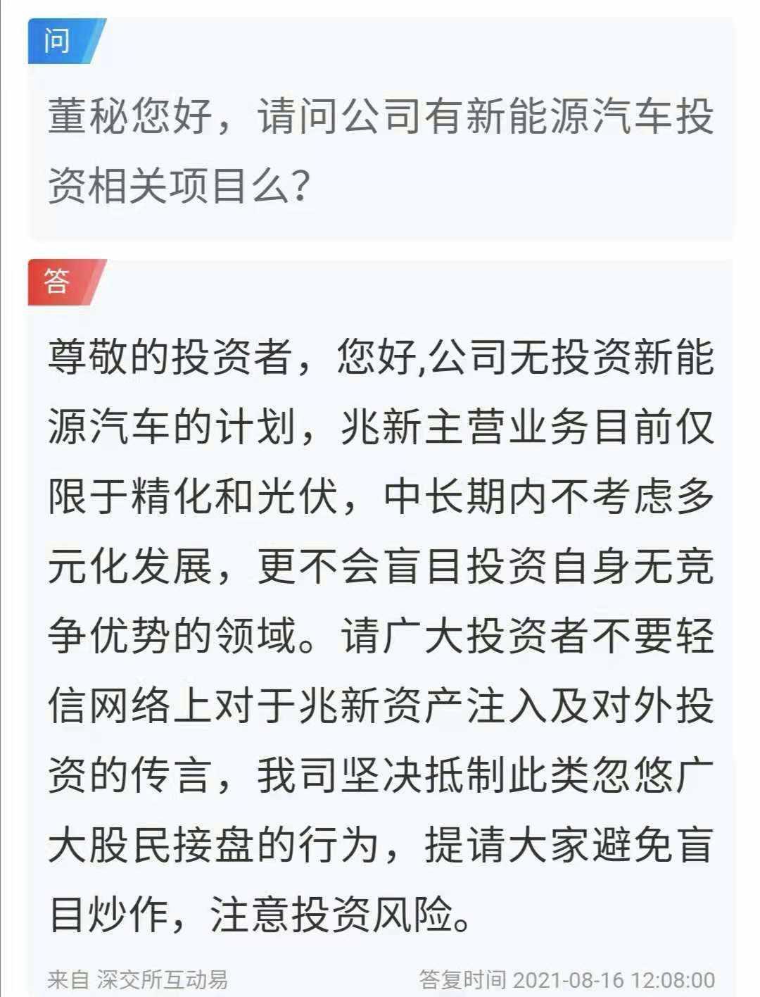 昨日中午,在回答股民的提问“公司有新能源汽车投资相关项目么”时,兆新股份明确表示无投资新能源汽车的计划,甚至回复了一句令外界震惊的话,那就是“我司坚决抵制此类忽悠广大股民接盘的行为”。