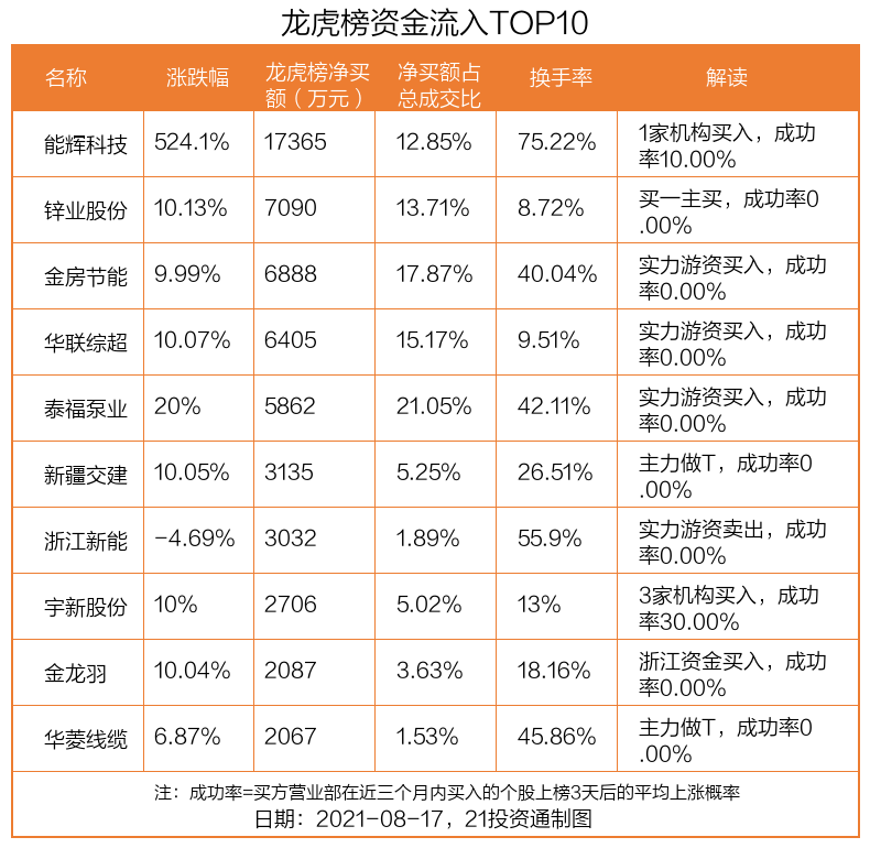39只上榜的龙虎榜个股中,17只个股被净买入,22只个股被净卖出。其中,资金净买入最多的是能辉科技,达1.74亿元,占总成交金额的12.85%。能辉科技当日收盘上涨524.1%,换手率为75.22%。