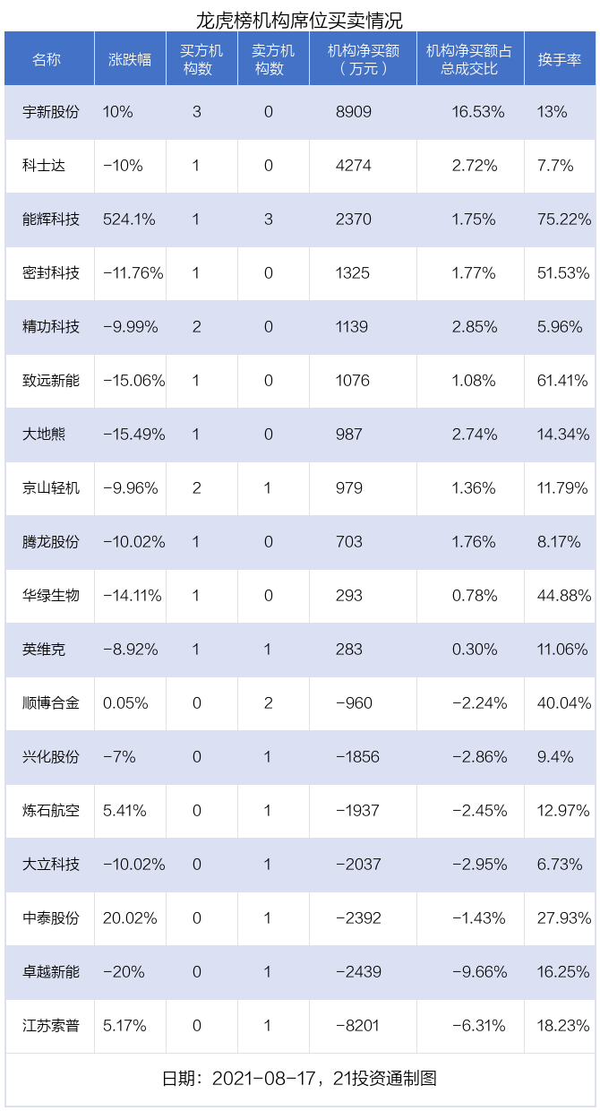 8月17日,上证指数下跌2%,深证成指下跌2.33%,创业板指下跌2.34%。盘后龙虎榜数据显示,共有39只个股因当日异动登上龙虎榜,资金净流入最多的是能辉科技(301046.SZ),达1.74亿元。