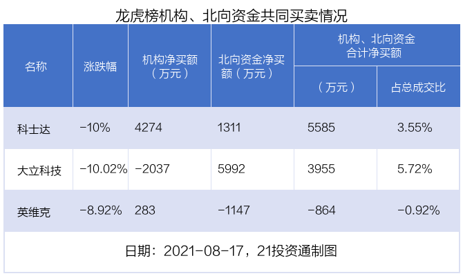 值得注意的是,机构和北向资金共同净买入了科士达等1股;在大立科技,英维克上出现分歧,机构净卖出大立科技2037.32万元,北向资金净买入5992.09万元。