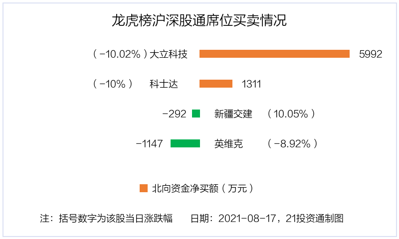 8月17日,北向资金参与龙虎榜中的个股共有4只,合计净买入5864.46万元。深股通净买入2 股,净卖出2 股,合计净买入5864.46万元。