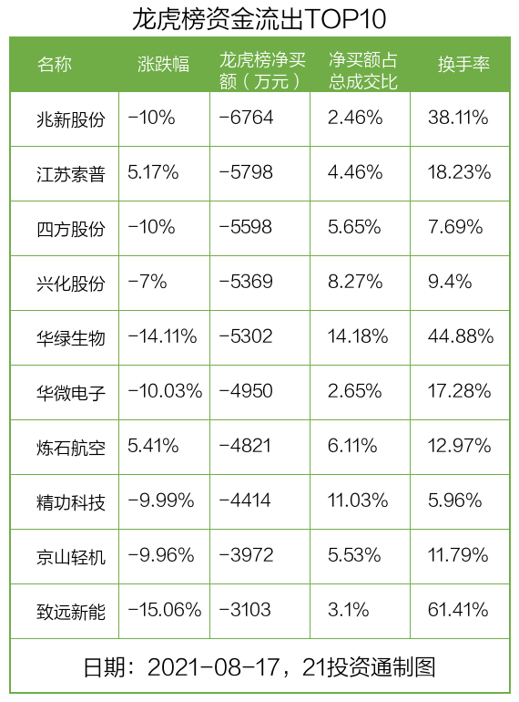 而龙虎榜中资金净流出最多的是兆新股份(002256.SZ),被净卖出为0.68亿元,占总成交金额的2.46%。兆新股份收盘下跌10%,换手率为38.11%。