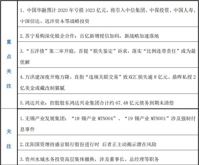 8月18日,债市重磅频出。央行、发展改革委、财政部、银保监会、证监会、外汇局联合发布《关于推动公司信用类债券市场改革开放高质量发展的指导意见》,为包括企业债、公司债、非金融企业债务工具在内的“公司信用类债券”提供上位法统筹。《意见》核心要点包括防范监管套利、禁止结构化发债行为、加强信用评级监管、压实中介机构信披责任、控制地方政府隐性债务风险、强调债券发行定价公开公平公正等,主要是针对规范债券市场交易与防范金融风险提出要求。同日,中国华融官宣引入战投,中信集团、中保投资、中国人寿、中国信达、远洋资本等拟通过认购新发行股份的方式进行战略投资,公告显示,中国华融2020年预计亏损超1029亿元。苏宁易购获得来自六家银行的百亿新增授信,资金链紧张的情况或有所转机。另外,备受关注的“五洋债”案二审也在昨天开庭,吸引了超10万次点击,中介机构方面首次提出投资人“损失鉴定”诉求,希望参照“中安消”案落实“比例连带责任”。