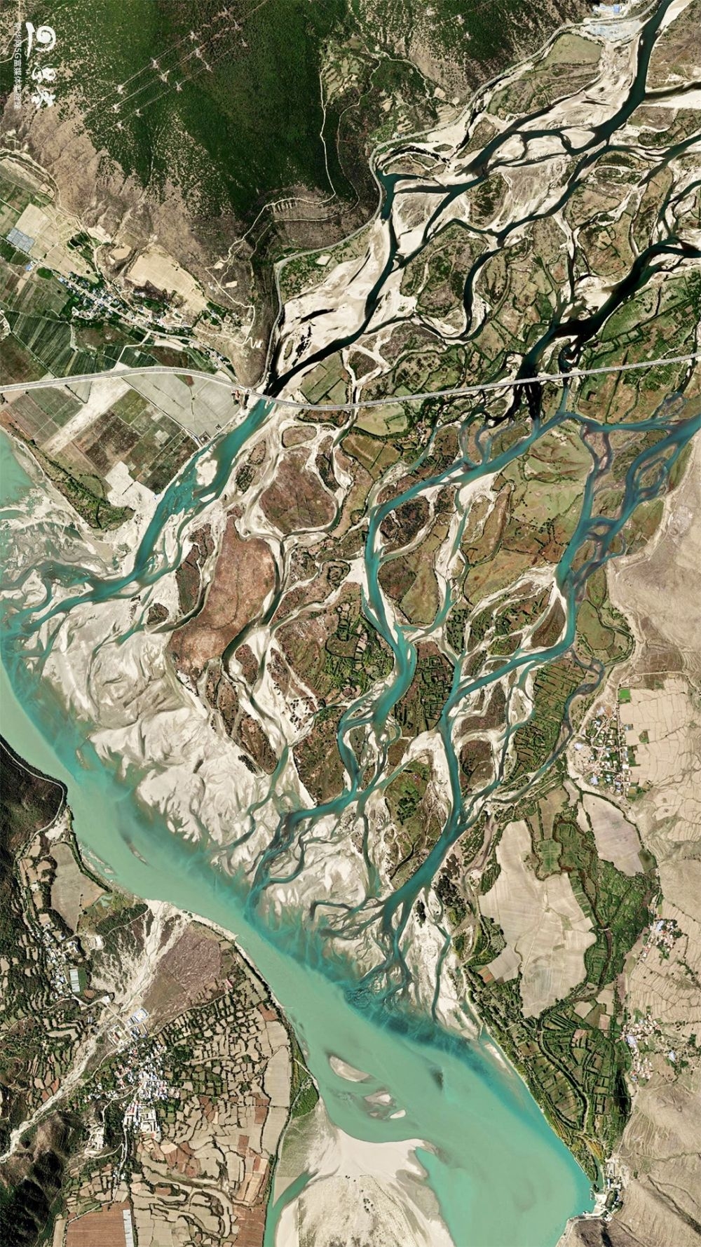 卫星视角下的尼洋河与雅鲁藏布江,一江一河交汇共同滋润林芝地区。卫星影像来源:天地图