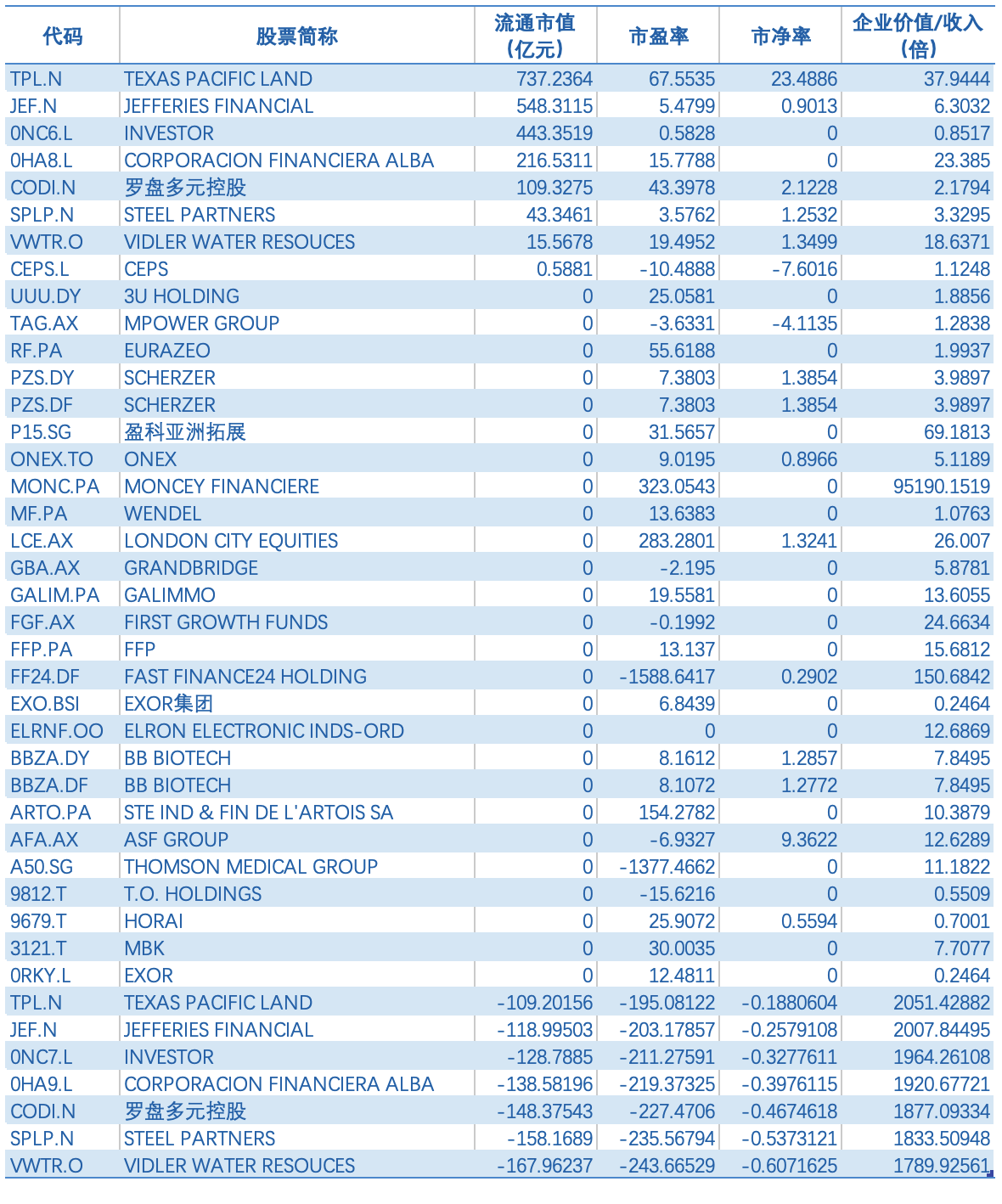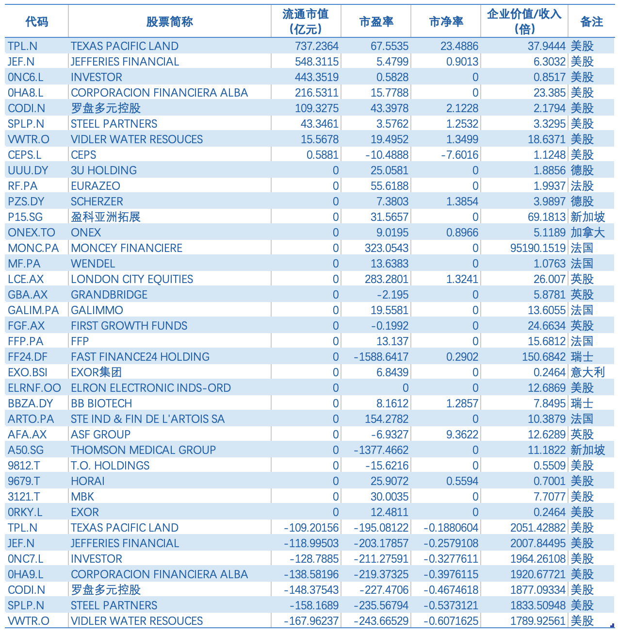 全球非中国主要企业有伯克希尔哈撒韦(BERKSHIRE)[BRK_B.N]、罗盘多元控股[CODI.N]、STEEL PARTNERS[SPLP.N]、VIDLER WATER RESOUCES[VWTR.O]、BB BIOTECH[BBZA.DF]、SCHERZER[PZS.DF]、MAIER + PARTNER[MPRK.DF]、INVESTOR[0NC6.L]、EXOR[0RKY.L]、KINNEVIK[0RH1.L]、ACKERMANS ORD SHS[0GYM.L]、CORPORACION FINANCIERA ALBA[0HA8.L]、CEPS[CEPS.L]、伯克希尔哈撒韦-B[0R37.L]、WENDEL ORD SHS[0HZD.L]、ONEX[ONEX.TO]、EXOR集团[EXO.BSI]等。