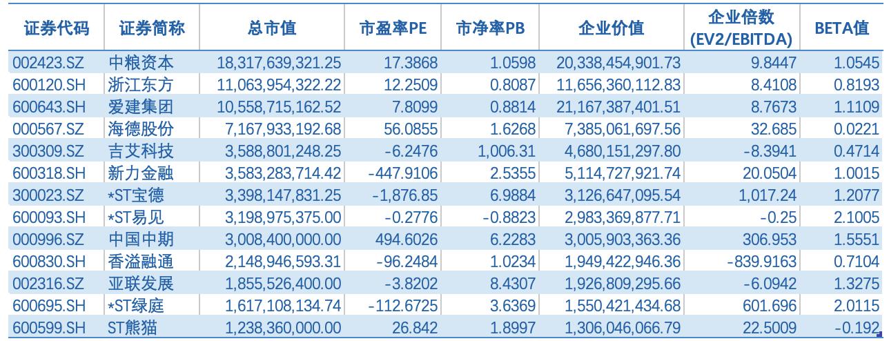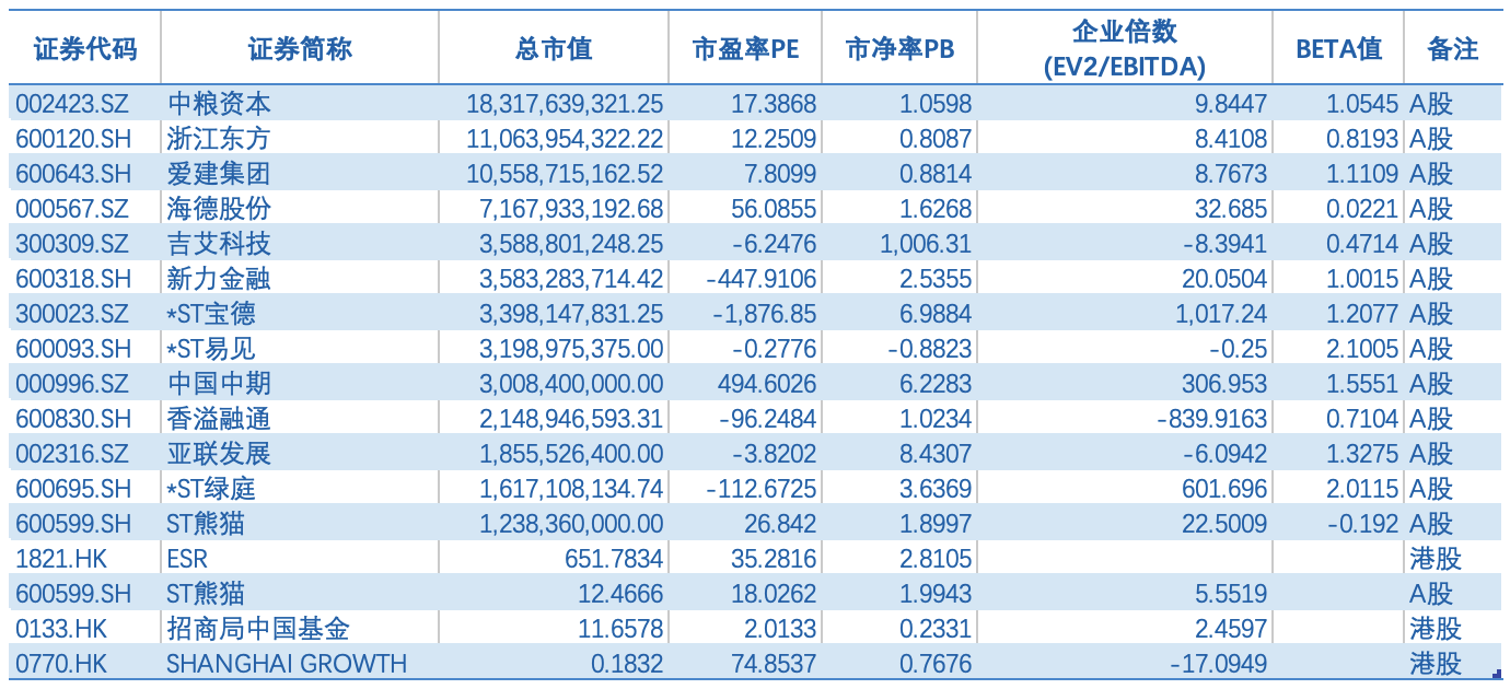 表 中国多领域控股行业上市公司估值对比