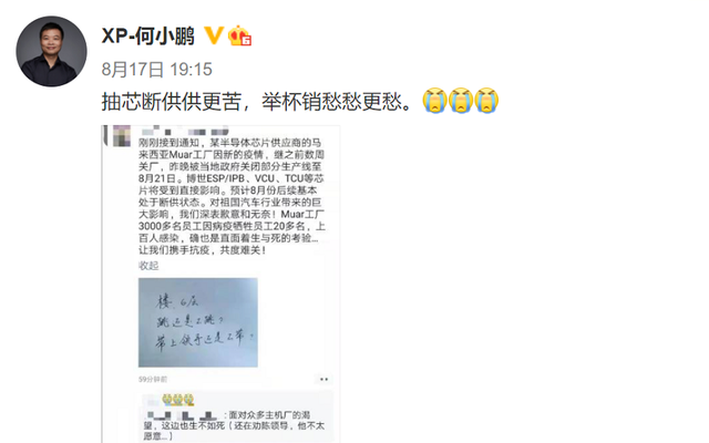 在何小鹏的这条朋友圈下面,小米CEO雷军以一个“唉”字作为评论。看起来中国的智能手机行业也因为马来西亚的疫情而不容乐观。