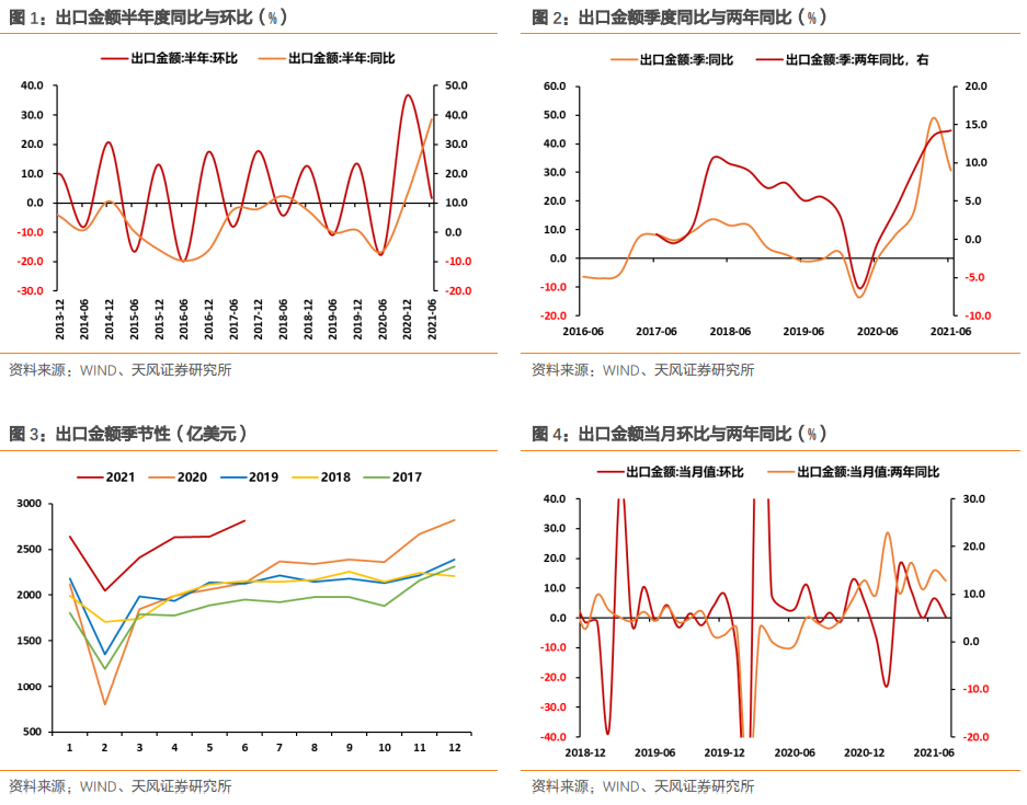 当月维度,上半年出口金额的绝对值持续明显高于季节性,环比持续正增长,两年同比虽然从2月23%的高位有所回落,但也基本维持在了两位数以上的增速水平。