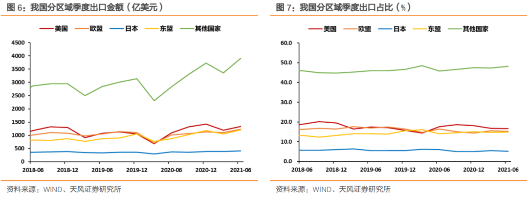 第一,上半年我国对东盟和其他国家的出口好,原因主要还是全球贸易扩张带来的原材料和中间品需求,当然,东盟和其他国家本身的需求保持在高水平也很重要。但上半年我国对东盟和其他国家的出口,可能已经受到了海外疫情扩散的影响。如果海外疫情改善,这些国家的需求可能有所恢复,尚不能判断后续对这些国家的出口是否已经停止扩张。