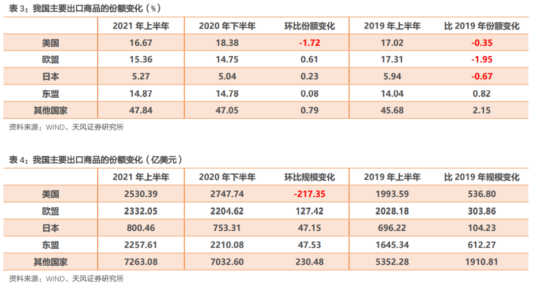 但也要考虑到,上半年我国对东盟和其他国家的出口,可能已经受到了海外疫情扩散的影响。以越南为例,美欧日以外的其他国家疫苗接种的进程仍比较缓慢,受疫情扩散和重症的影响仍比较大。如果后续海外疫情改善,这些国家的需求可能会有所恢复,因此尚不能判断后续对这些国家的出口是否已经停止扩张。