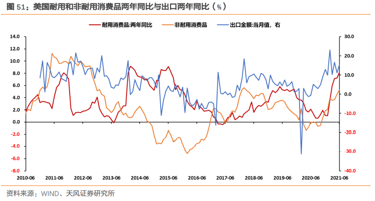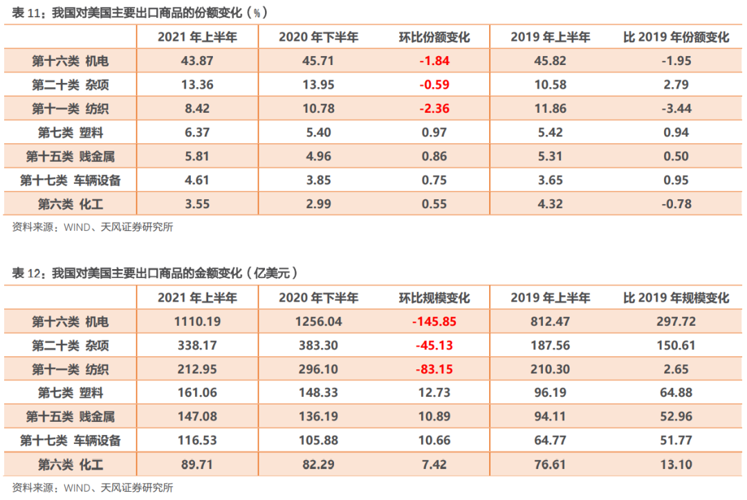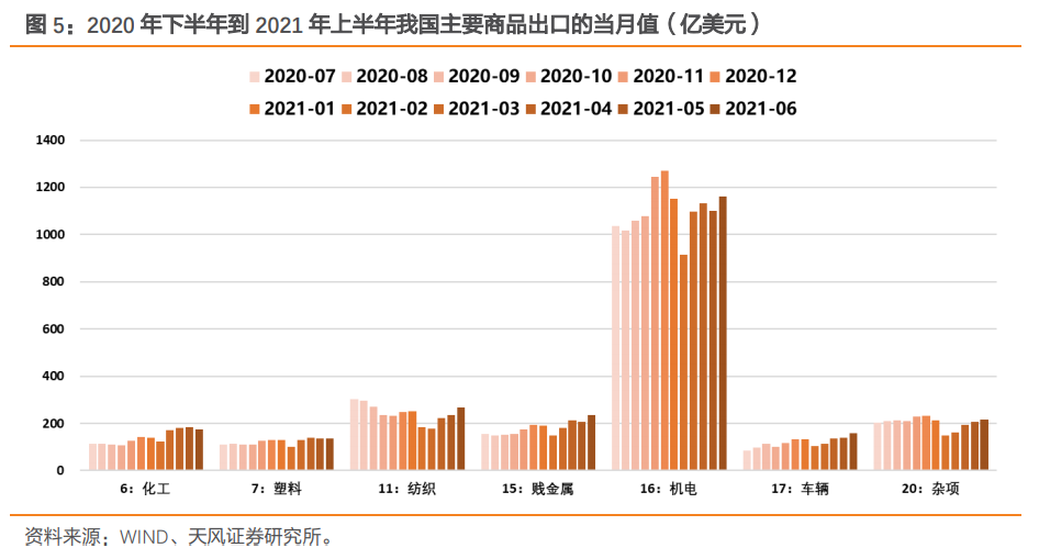 再次,机电和杂项商品消费也不差。机电出口占我国总出口的比重超过50%,上半年的出口份额与金额虽然有所下滑,但也要看到,机电与杂项的出口金额还是远高于2019年上半年。2020年下半年表现太好,可能是机电与杂项上半年环比回落的主要原因。