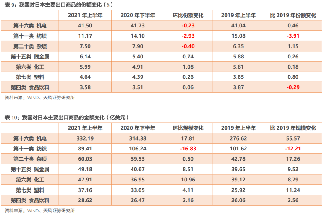 第一,依旧是好在中间品和原材料出口。上半年我国对日本贱金属、化工和塑料出口的表现均较好,只是排序有所不同。