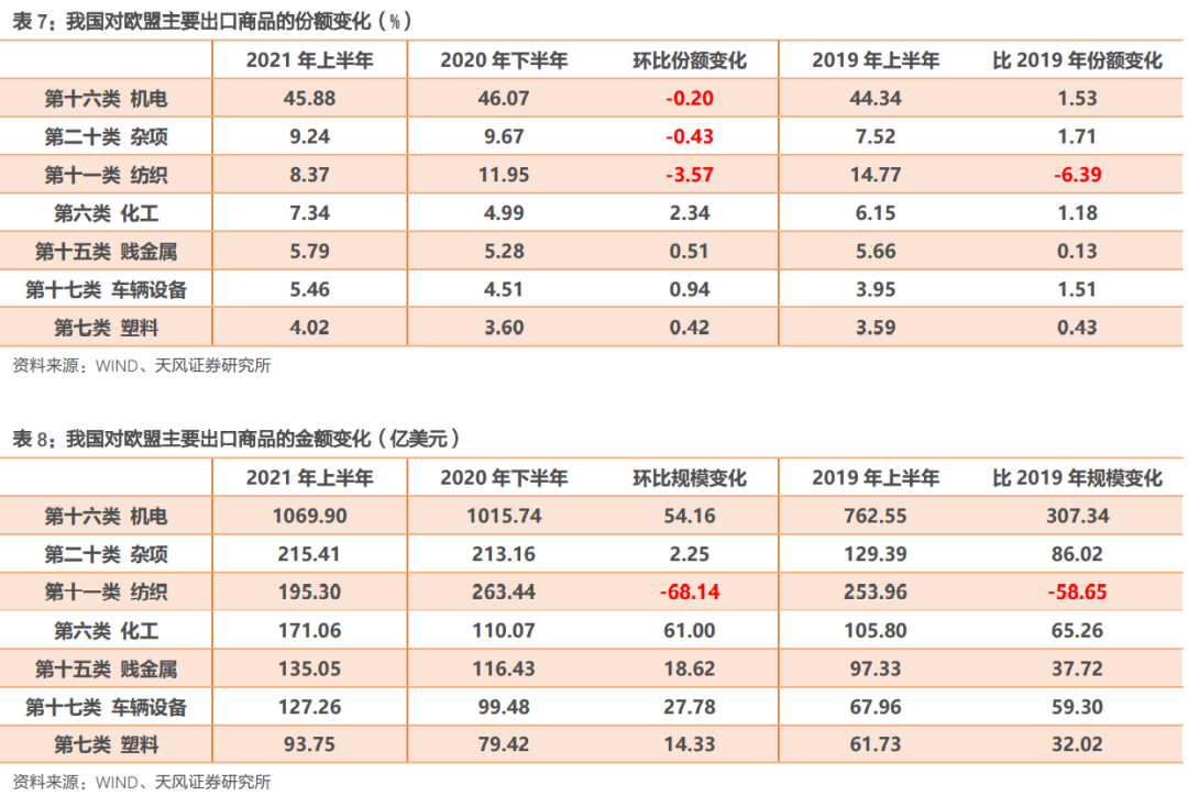 第二,在全球贸易与产业链的扩张或后继乏力,以及出口份额逐步恢复的情况下,下半年我国对欧盟和日本原材料和中间品出口的扩张空间可能也有限。