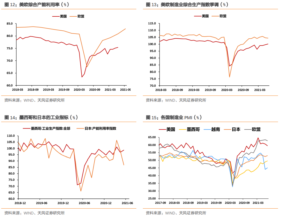 当前美欧和墨西哥等国的多项制造业指标已经基本回到疫情前水平,不排除个别区域制造业持续上行的可能,只是进一步提升的空间已经比较有限。但受疫情影响的情况下,日本和越南的生产还是受到明显影响的,随着海外疫情的改善,后续日本和越南等国的生产可能会有所改善。