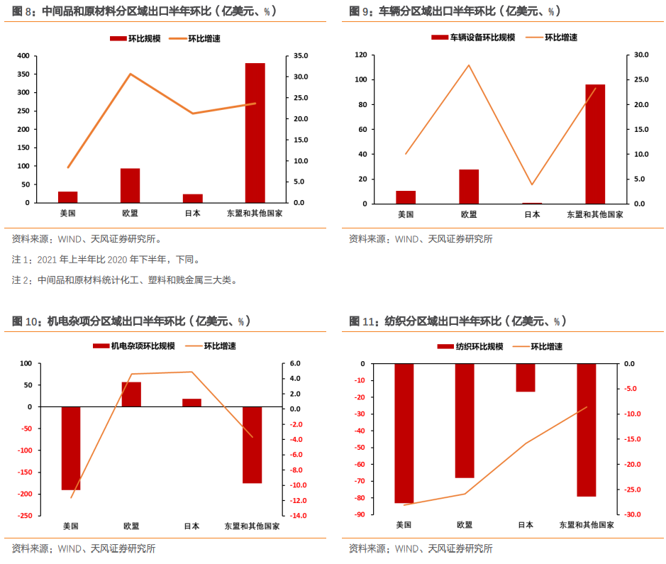 第一,上半年我国对各国的中间品和原材料出口都有明显扩张,但对东盟和其他国家、对欧盟的中间品和原材料出口还是要明显对美日的出口。