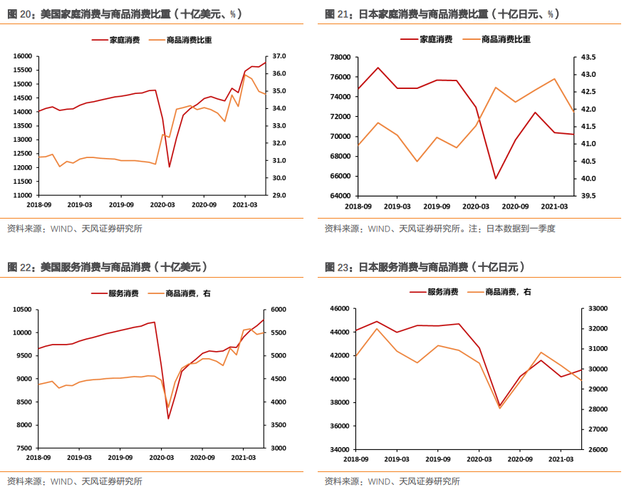 由此可知,对日本而言,上半年商品消费的扩张,主要是整体经济复苏带动了居民收入的增长,商品消费对服务消费的替代效应贡献并不大。猜测日欧表现类似。