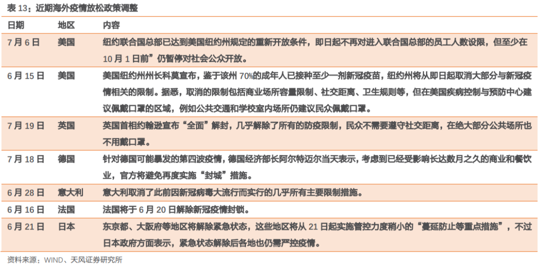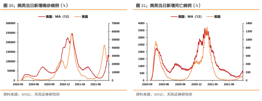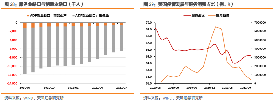 再看服务业重启,同样以美国为例,从服务业就业缺口看,美国服务业重启还有很大的潜力,当前风险主要在疫情扩散。但我们强调,本轮全球疫情扩散的逻辑不同此前,在很大程度上,是美欧当局有意推动的结果。由于迟迟无法有效防止疫情扩散,在德尔塔病毒有流感化趋势,且疫苗能够起到重症率与死亡率保护的情况下,美欧当局为了推动经济复苏,有意识地在减轻疫情防控措施。如此一来,伴随着本轮疫情防控的,可能会是服务业的加速服务。