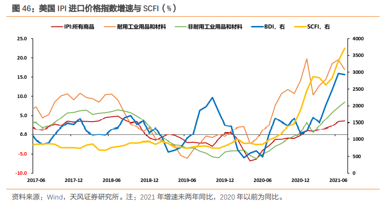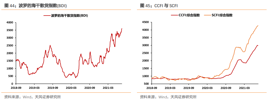 结合美国的IPI进口价格指数,我国能对上述推论进行交叉验证。今年以来,无论是非耐用品还是耐用品,美国进口工业用品和原材料的价格增速明显快速上行,并且与波罗的海运价指数(BDI)和上海出口集装箱运价指数(SCFI)有非常高的相关性。