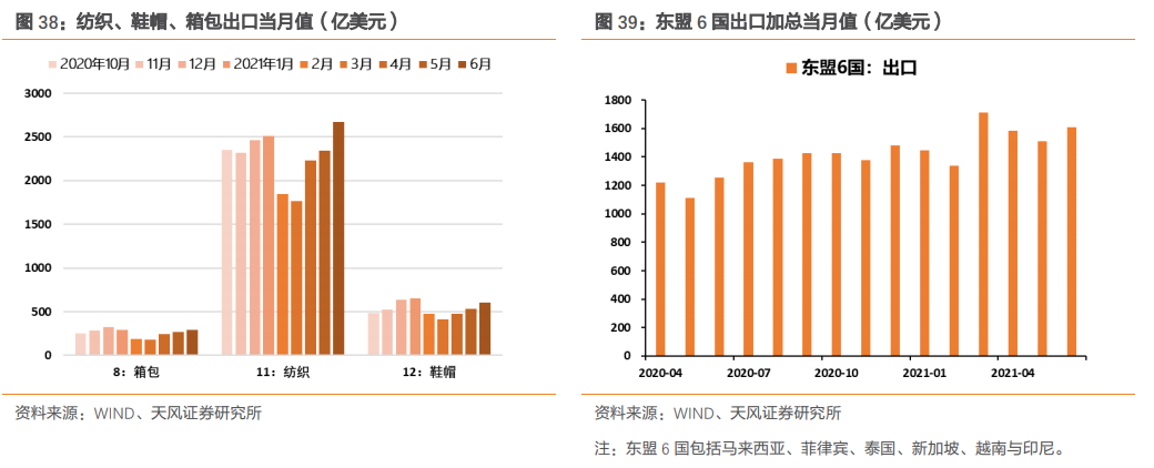 纺织鞋帽箱包在东盟的更有成本优势,如果与东盟出口进行比较,在二季度疫情影响东盟生产的情况下,我国纺织鞋帽出口的趋势上行,其实有对东盟订单的替代效应。我国纺织鞋帽箱包出口的增长,其实是伴随着东盟出口整体的回落的。