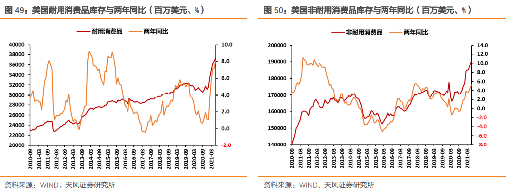 美国当前耐用和非耐用消费品的库存在绝对值上都到了历史峰值的位置,两年同比增速也基本回到了前期高点左右,补库存可能已经接近尾声。