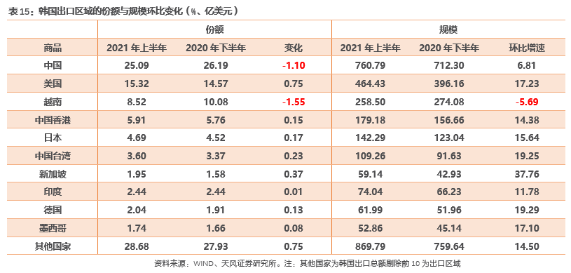 第三,好在全球产业链的逐步复苏,更进一步推动了东盟和其他国家对我国原材料和中间品的进口需求。因此能够看到,作为全球贸易的金丝雀,上半年韩国出口增速也明显抬升。同时与我国出口产品有明显上下游关系的越南与台湾出口增速,也在上半年明显抬升。