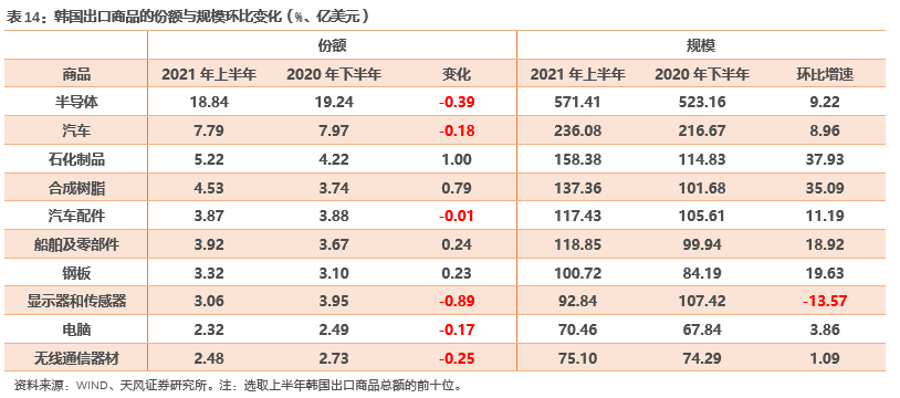 从韩国出口商品的结构观察,推动上半年韩国出口的也主要是石化、树脂、钢板、船舶和车辆零部件之类的原材料和中间品,其占韩国出口的份额进一步提升,规模环比增速也普遍在两位数以上。而整车和宅经济零部件的出口,例如半导体、显示器和传感器、电脑和无线通信器材的出口份额则整体下滑,环比增速基本回落至两位数以内。