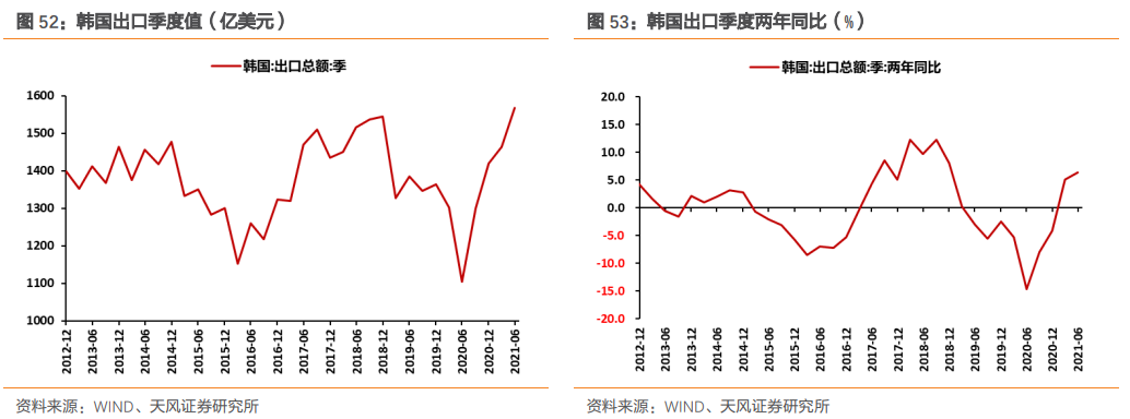 需要考虑的是,韩国出口的复苏整体滞后于我国,我国出口在去年下半年就已经明显超过了前一周期的顶点位置,而韩国出口在今年上半年才高于前一周期的高点。并且韩国半导体的出口放缓,本身也有受海外疫情扩散的影响。因此下半年韩国出口能否继续扩张还要继续观察,对我国出口的领先态势也需要继续观察。