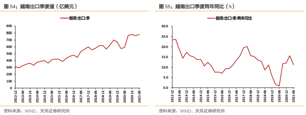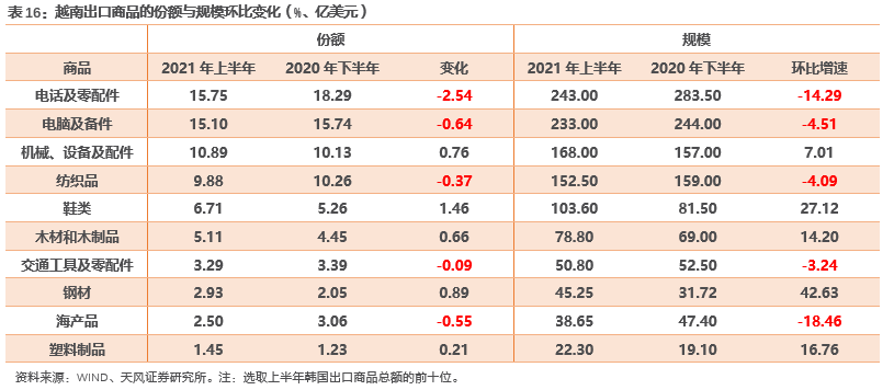 数据受限,我们主要观察上半年越南出口商品结构的变化。推动上半年越南出口的同样主要是机械设备、钢材、木制品和塑料等原材料和中间品出口,上述商品上半年的环比均高增,占越南出口的份额也进一步提升。鞋类是越南的优势产业,随着全球经济复苏,非耐用品消费是有所提升的。而电话及零配件、电脑及备件、电子产品等与宅经济相关的商品出口,在上半年则出现了与我国类似的环比回落和份额减少的情况,对上半年越南出口的推动力明显减弱。