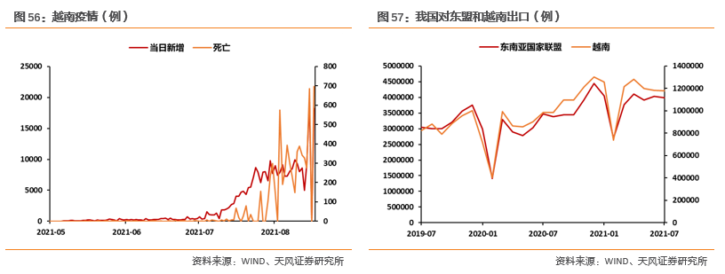 需要提醒的是,今年以来越南明显受疫情扩散的困扰,这可能是越南生产回落的重要原因之一。参考我国对东盟和越南出口,疫情扩散也可能是上半年我国对东盟出口没有进一步扩张的重要原因。后续如果海外疫情的逐步好转,我国对东盟和其他国家的出口仍有恢复的可能。因此从越南数据出发,后续我国对越南和其他国家出口还是存在扩张的可能,需要进一步观察。