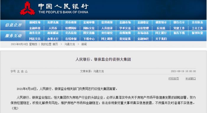 2021年8月19日,人民银行、银保监会相关部门负责同志约谈恒大集团高管。
