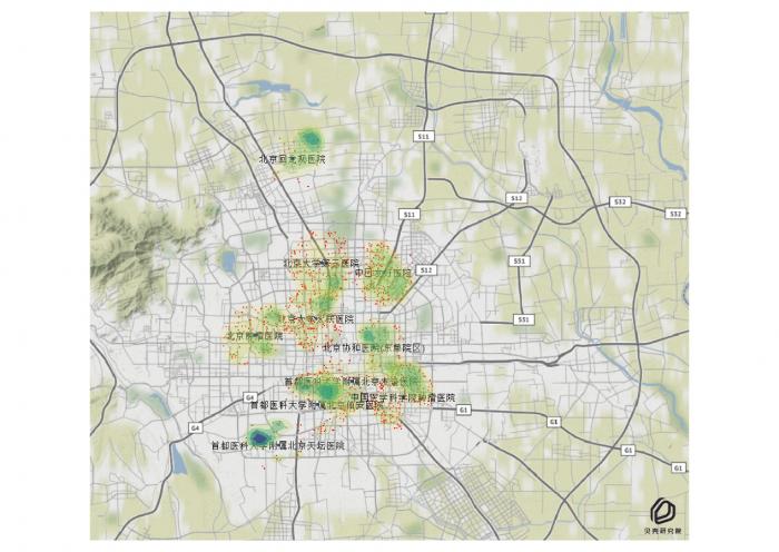 说明:北京回龙观医院、北京大学第三医院、北京大学人民医院等10所医院周边小区的密度分布图,红色圆点表示小区,同时密度图中,颜色越深,表示小区分布越集中。