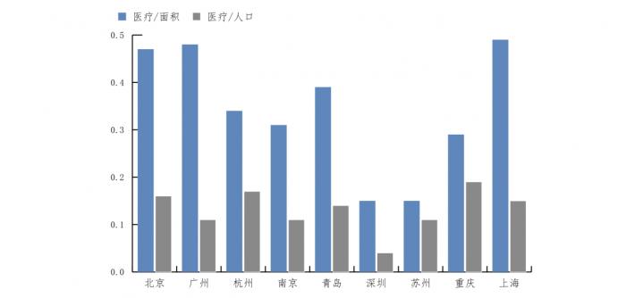 对比不同城市内部下辖行政区县具体数值,上海、广州、北京这些一线城市主城区外的区县面积较大,单位面积医疗资源偏低,导致城市内部单位空间对应医疗资源水平标准差较大;中心城区虽然医疗资源总量可以,但因为人口总量太大,单位人口医疗资源不足,导致重庆、杭州、北京等城市内部单位人口对应的医疗资源水平标准差较大。